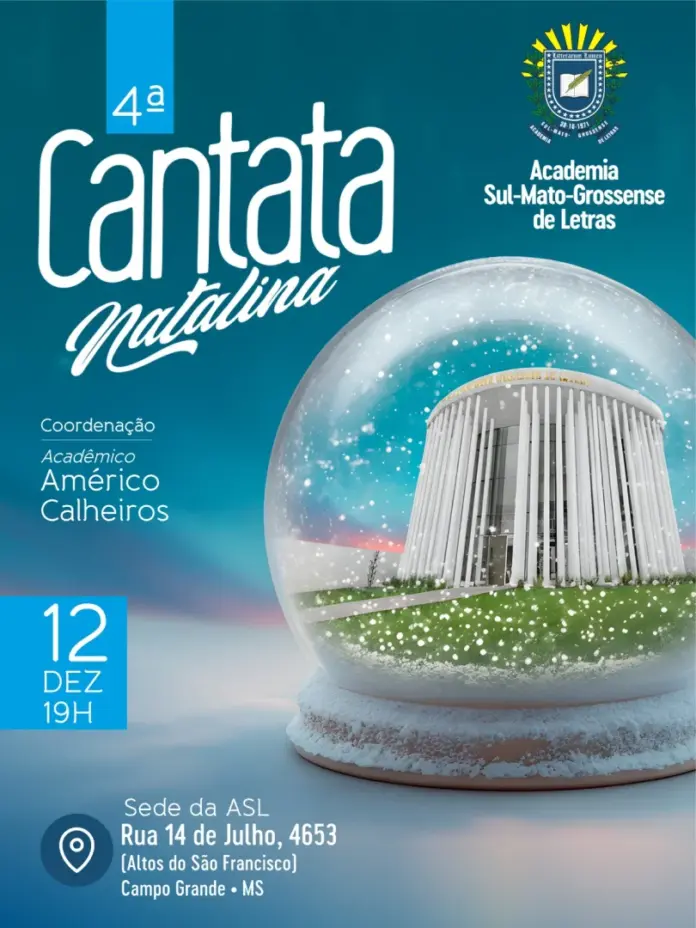 Já tradicional no calendário anual de eventos da Academia Sul-Mato-Grossense de Letras, será realizada, no dia 12 de dezembro, a 4ª Cantata Natalina da ASL, reunindo oito Corais de Campo Grande (sexta-feira, no auditório da instituição, às 19h). O evento, que encerra as atividades em 2025 da ASL, tem a coordenação do acadêmico Américo Calheiros e o público terá a oportunidade de assistir apresentações de tradicionais canções natalinas e outras que evidenciam o espírito do Natal.