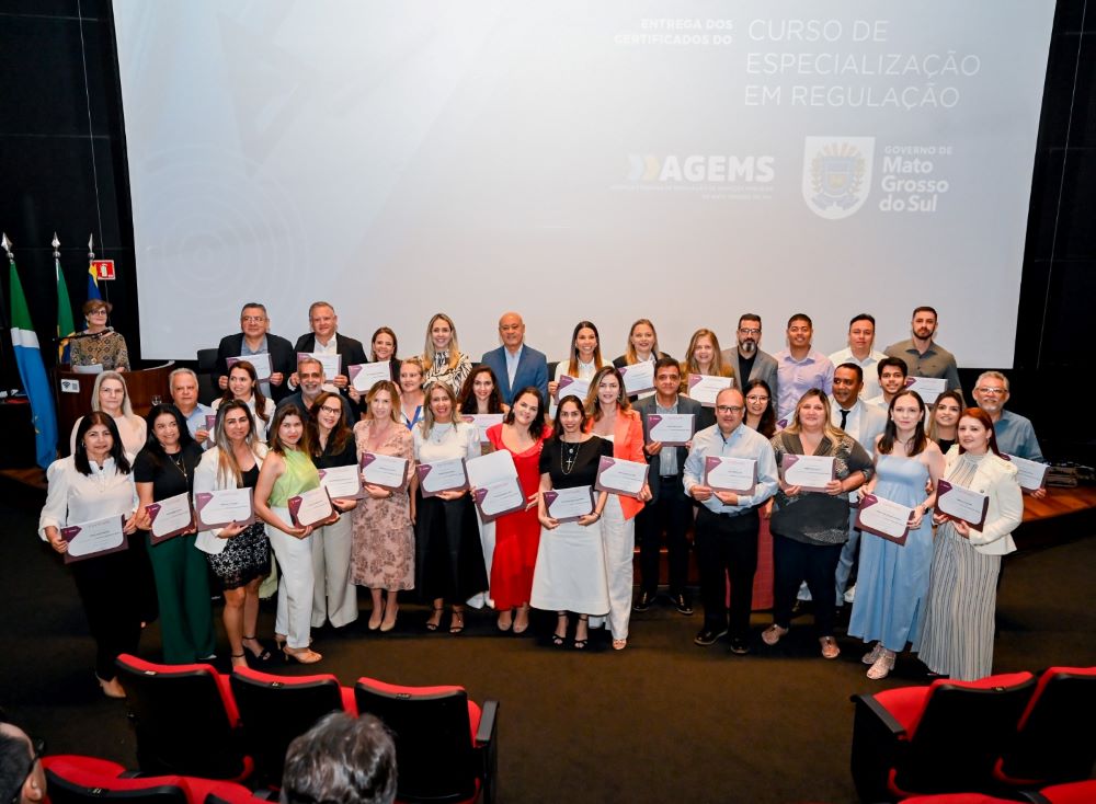 Um marco na história da regulação sul-mato-grossense foi celebrado nesta terça-feira (6), com a entrega dos certificados de conclusão da primeira Especialização em Regulação promovida pela Agência Estadual de Regulação (AGEMS). Em cerimônia realizada no auditório do Bioparque Pantanal, 40 servidores das mais diversas áreas e funções da Agência – incluindo quatro diretores – foram reconhecidos como especialistas, após dois anos de formação inédita.