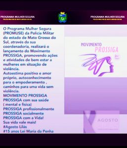 O Programa Mulher Segura – Promuse da Polícia Militar do Estado de Mato Grosso do Sul, por meio da Coordenadoria de Polícia Comunitária , realizará no mês de agosto vários eventos relativos ao Agosto Lilás.