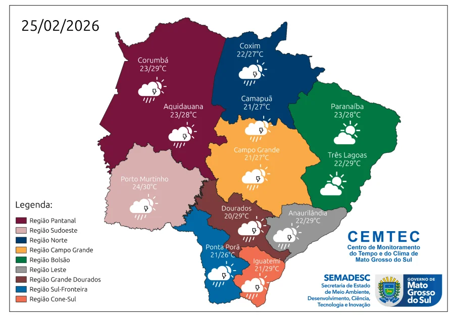 A meteorologia indica que as condições de maior instabilidade atmosférica seguirão sob Mato Grosso do Sul nesta quarta-feira (25), favorecendo o aumento de nebulosidade e a ocorrência de temperaturas mais amenas. Em muitas cidades, os termômetros não ultrapassarão 30°C.