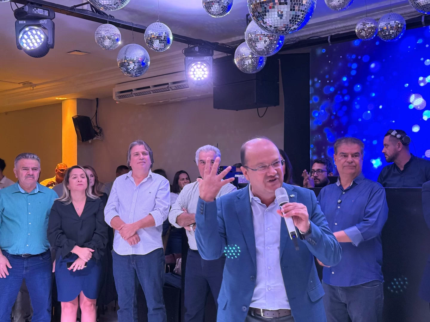 O ex-governador Reinaldo Azambuja justificou a ausência do governador Eduardo Riedel, que estava atendendo à mãe após uma queda, e manifestou satisfação em participar de uma confraternização que reuniu lideranças dos 79 municípios de Mato Grosso do Sul.