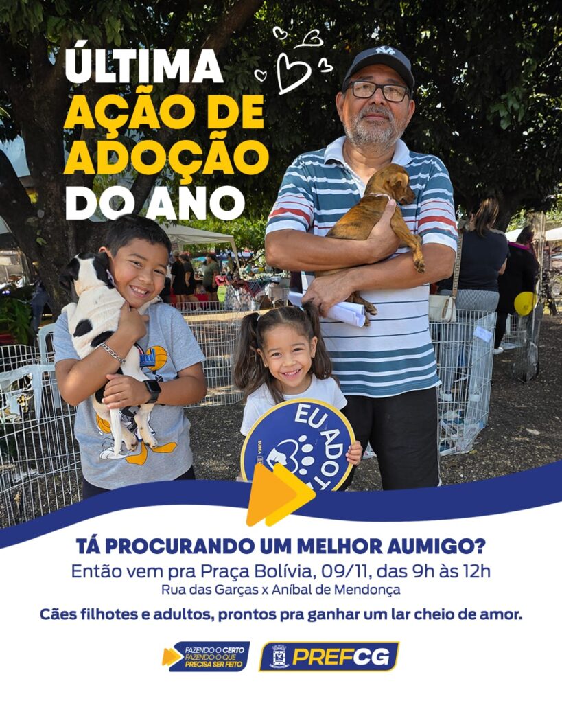 A Prefeitura de Campo Grande, por meio da Superintendência de Bem-Estar Animal (Subea), realiza no próximo domingo, 9 de novembro, a última feira de adoção do ano, reunindo cães e gatos, filhotes e adultos, que foram resgatados de situações de abandono e maus-tratos. A ação acontece das 9h às 12h, na Praça Bolívia (Rua das Garças com Aníbal de Mendonça).