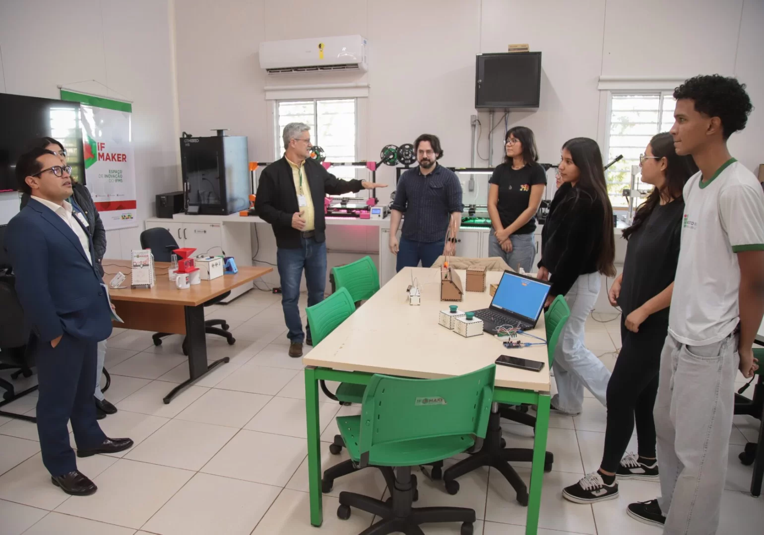 “Eu trabalho na política que não é nada brilhante igual o que vocês fazem aqui, mas é muito significativo. O meu trabalho é criar oportunidades para que políticas públicas sejam desenvolvidas. E eu me sinto comprometido com o que vocês fazem”, disse o vereador aos estudantes do laboratório IFMaker.