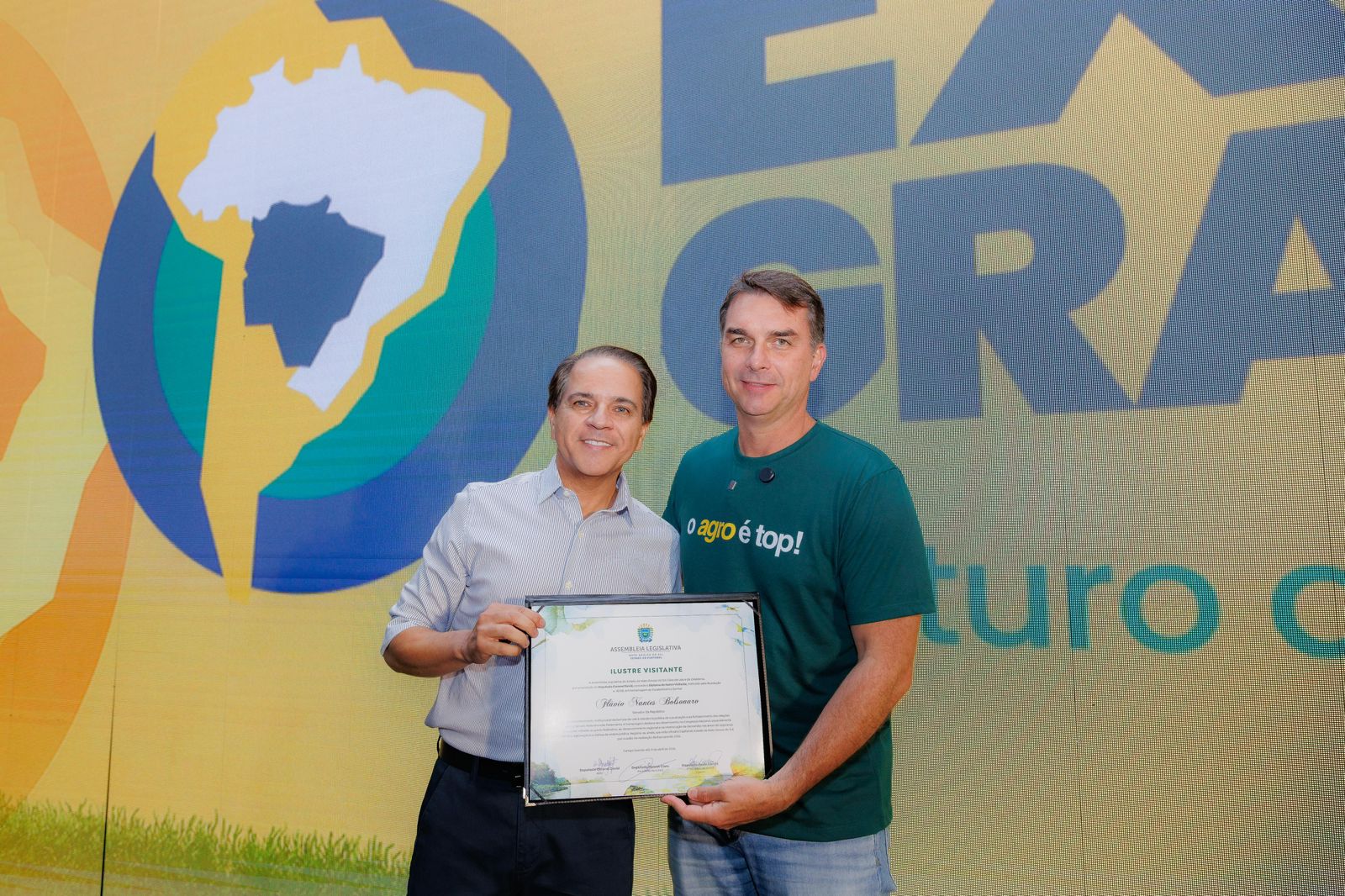 Durante a programação da Expogrande, nesta quinta-feira (9), o deputado estadual Coronel David (PL) realizou a entrega do Diploma de Ilustre Visitante ao senador Flávio Bolsonaro, em reconhecimento à sua atuação no cenário nacional e à sua presença em Mato Grosso do Sul.
