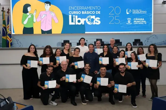 A Câmara Municipal de Campo Grande promoveu, na manhã desta sexta-feira, dia 12, a entrega de certificados de conclusão do curso Noções Básicas de Libras (Língua Brasileira de Sinais) a 23 alunos, entre servidores e pessoas da comunidade. O curso iniciou em abril, com aulas semanais, ministradas pelas professoras Intérpretes de Libras, Janaína Saraiva e Helga Pereira, servidoras efetivas da Casa de Leis. O ensinamento representa um passo importante para inclusão e acessibilidade da comunidade surda.