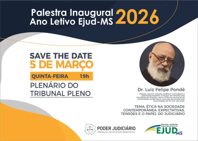 A Escola Judicial de Mato Grosso do Sul (Ejud-MS) realizará, no dia 5 de março, às 19 horas, no Plenário do Tribunal de Justiça de Mato Grosso do Sul (TJMS), a Palestra Inaugural do Ano Letivo de 2026, evento que marca oficialmente o início das atividades acadêmicas da Escola Judicial.