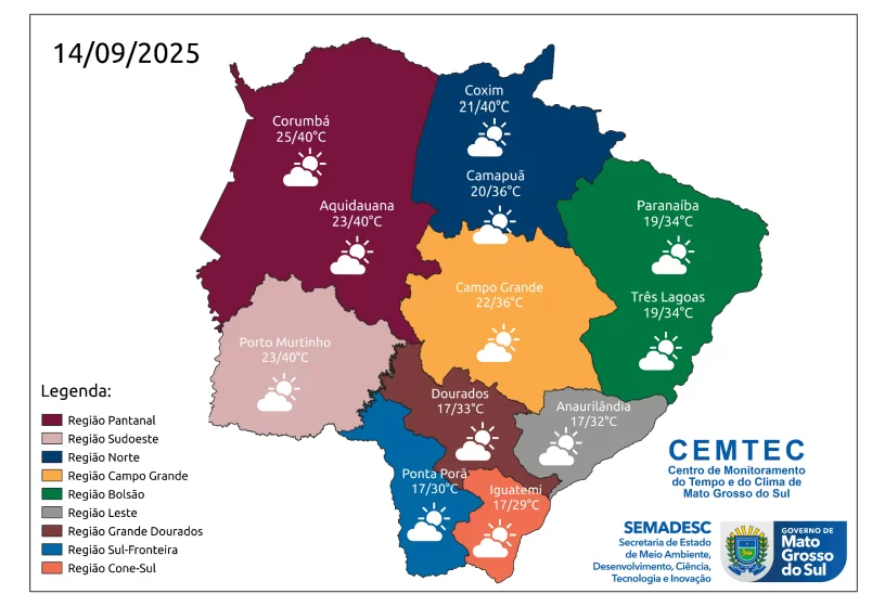 Estão previstas mínimas entre 16°C e máximas 34°C para as regiões sul, cone-sul e grande Dourados. Nas regiões sudoeste e pantaneira, as temperaturas devem variar entre 21°C e 41°C. Já nas regiões do bolsão, leste e norte os termômetros devem registrar mínima de 19°C e máxima também de 41°C.