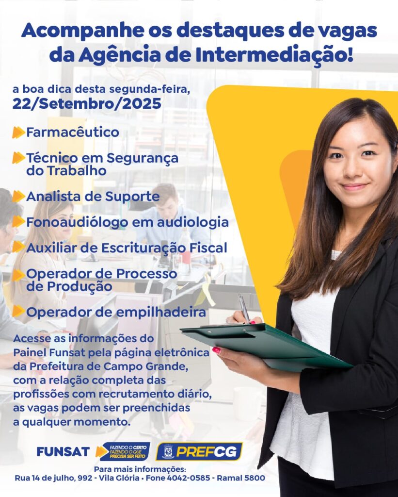 A partir das 7h da próxima segunda-feira, 22 de setembro, a Funsat inicia a semana com diversas vagas abertas, incluindo: