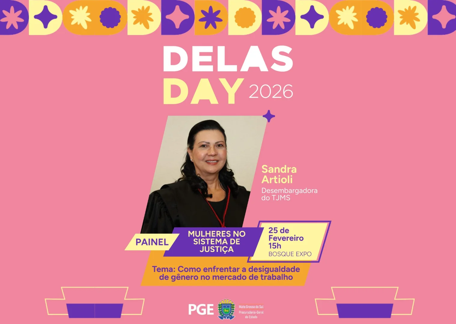TJMS no Delas Day – A Desembargadora Sandra Artioli, responsável pela Coordenadoria Estadual da Mulher em Situação de Violência Doméstica e Familiar em MS, participa, a convite da Procuradoria-Geral do Estado de Mato Grosso do Sul, do painel “Mulheres no Sistema de Justiça: Como enfrentar a desigualdade de gênero no mercado de trabalho”. O debate será realizado no dia 25 de fevereiro, das 15 às 17 horas, e integra a programação oficial do evento, que neste ano tem como mote “Nossa identidade, nossa força”.