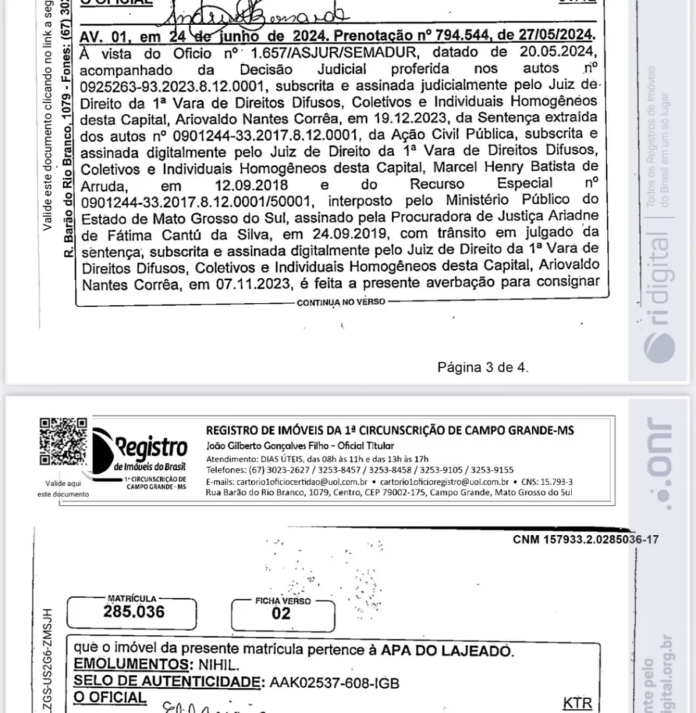 Documentos revelam que o Ministério Público Estadual já obteve decisão judicial determinando que a matrícula do imóvel (Matrícula nº 285.036) contenha um gravame expresso: o terreno pertence a uma Área de Proteção Ambiental — o que impõe restrições severas de uso e ocupação do solo. A decisão foi proferida no âmbito da Ação Civil Pública nº 0901244-33.2017.8.12.0001.