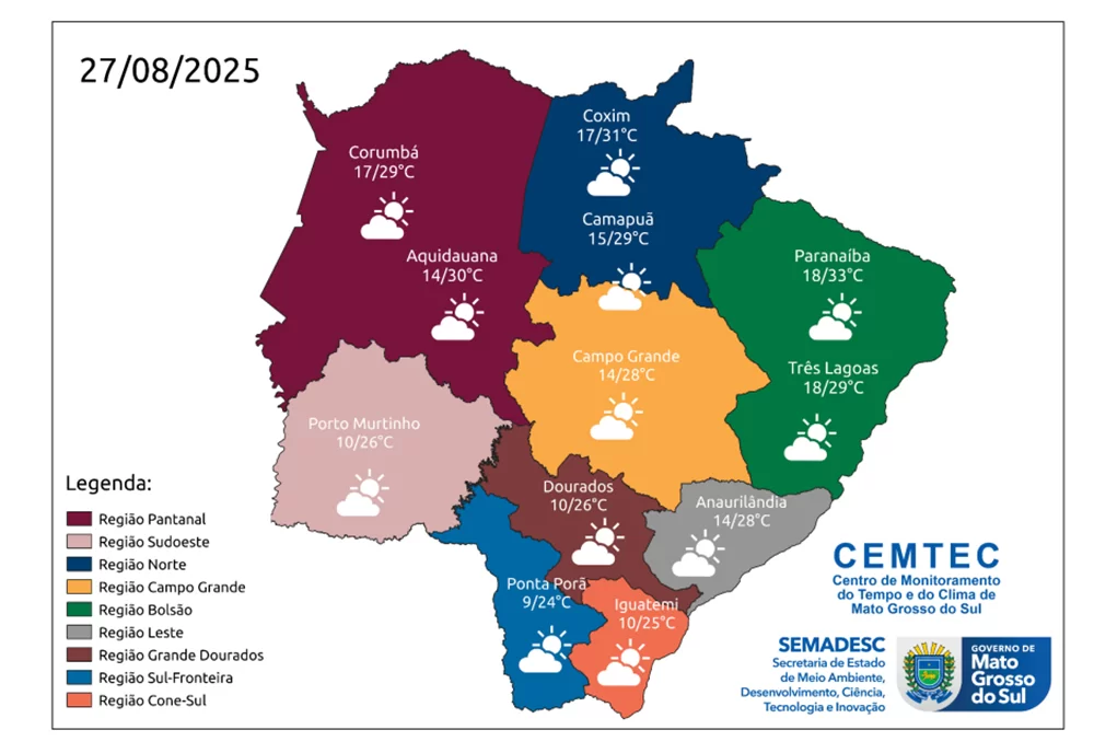 A quarta-feira (27) será de temperaturas em elevação em Mato Grosso do Sul, com destaque para o calor nas regiões norte e leste do Estado. Campo Grande terá máxima de 28°C, mesma marca esperada em Anaurilândia, enquanto em Dourados a temperatura deve alcançar 26°C.