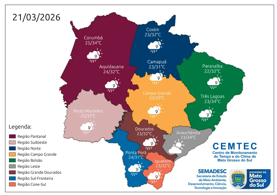 O Cemtec (Centro de Monitoramento do Tempo e Clima de Mato Grosso do Sul) também aponta cenário semelhante, com previsão de chuva em todas as regiões de Mato Grosso do Sul durante o fim de semana. Conforme o Cemtec, ao longo do período, o aquecimento diurno, aliado à disponibilidade de calor e umidade, favorece o aumento da nebulosidade e a ocorrência de chuvas, principalmente entre a tarde e noite.