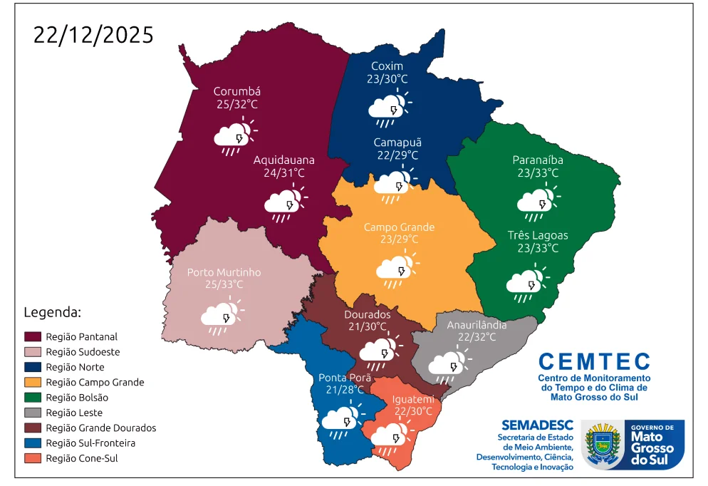 As temperaturas permanecem elevadas em todas as regiões. Em Campo Grande, os termômetros devem marcar entre 23 °C e 29 °C. No Pantanal, Corumbá registra mínima de 25 °C e máxima de 32 °C, enquanto Porto Murtinho pode chegar aos 33 °C.