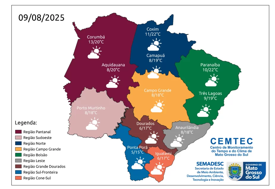 Em relação às temperaturas, estão previstas mínimas entre 3-6°C e máximas entre 15-23°C para as regiões sul, cone-sul e grande Dourados. Nas regiões sudoeste e pantaneira, as mínimas devem variar entre 6-13°C e as máximas entre 18-25°C.