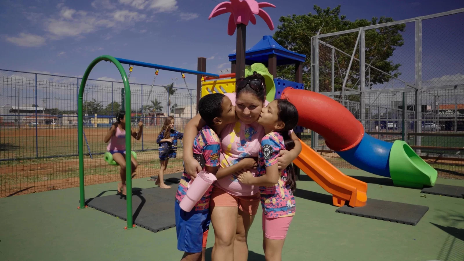 “Essa praça era destruída, vivia cheia de meninos nas ruas. Depois que veio a Arena, meus filhos começaram a frequentar, fazem futebol e adoram. A gente vê crianças com deficiência ou autismo evoluindo, ganhando coordenação, aprendendo a jogar. O parquinho está sempre cheio, vem gente de outros bairros, é muita alegria. Mudou tudo, hoje o bairro tem visibilidade, não é mais mal falado, e à noite fica tudo iluminado, cheio de famílias. É uma maravilha!”, conta alegre que recebe beijos dos filhos no novo parquinho.