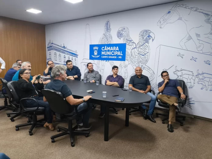 O presidente da Câmara Municipal de Campo Grande, vereador Epaminondas Vicente Neto, o Papy, e integrantes da Frente Parlamentar de Acompanhamento da Implantação da Rota de Integração Latino-Americana (RILA), reuniram-se nesta segunda-feira (16) com representantes do Executivo Estadual e Municipal, além de lideranças do setor de transporte e logística, para discutir ações práticas relacionadas à Rota Bioceânica.