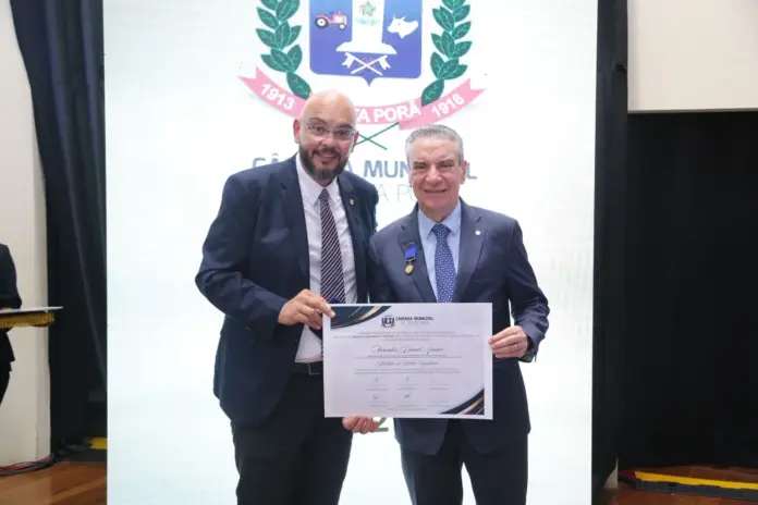 O 1º secretário da Assembleia Legislativa, deputado Paulo Corrêa (PSDB), foi homenageado nesta quarta-feira (10) com a Comenda do Mérito Legislativo concedida pela Câmara Municipal de Ponta Porã. A honraria, proposta pelo presidente da Casa de Leis, vereador Agnaldo Pereira Lima, reconhece personalidades que contribuem para o desenvolvimento e o progresso do município.