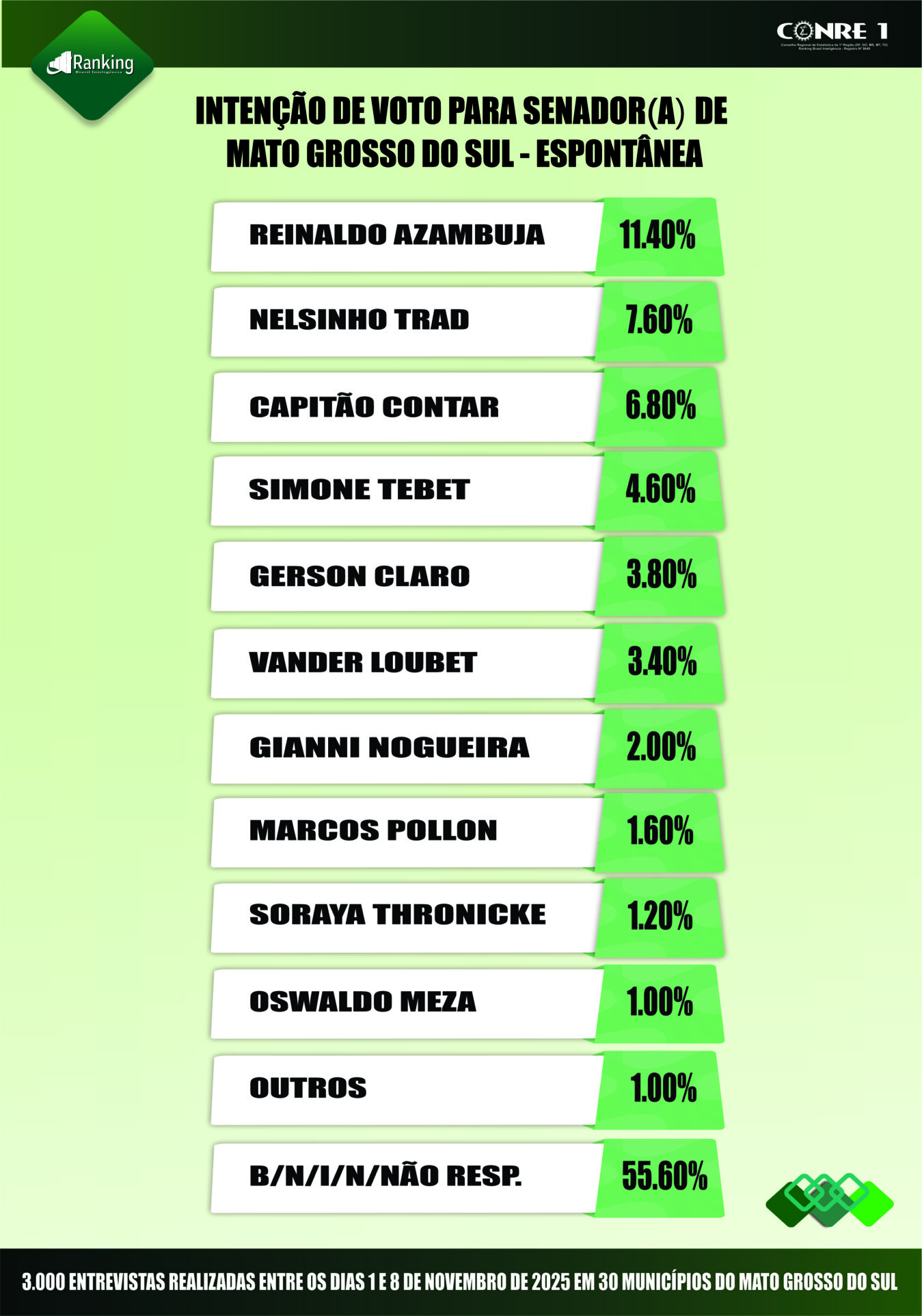 Por encomenda da Rede de Rádios Top FM, a sexta pesquisa realizada pelo Instituto Ranking Brasil Inteligência, de 1º a 8 de novembro deste ano, junto a 3 mil moradores com 16 anos ou mais de idade, em 30 municípios de Mato Grosso do Sul, com intervalo de confiança de 95% e margem de erro de 1,8 ponto percentual para mais ou para menos, traz as intenções de votos para as duas vagas ao Senado no Estado.