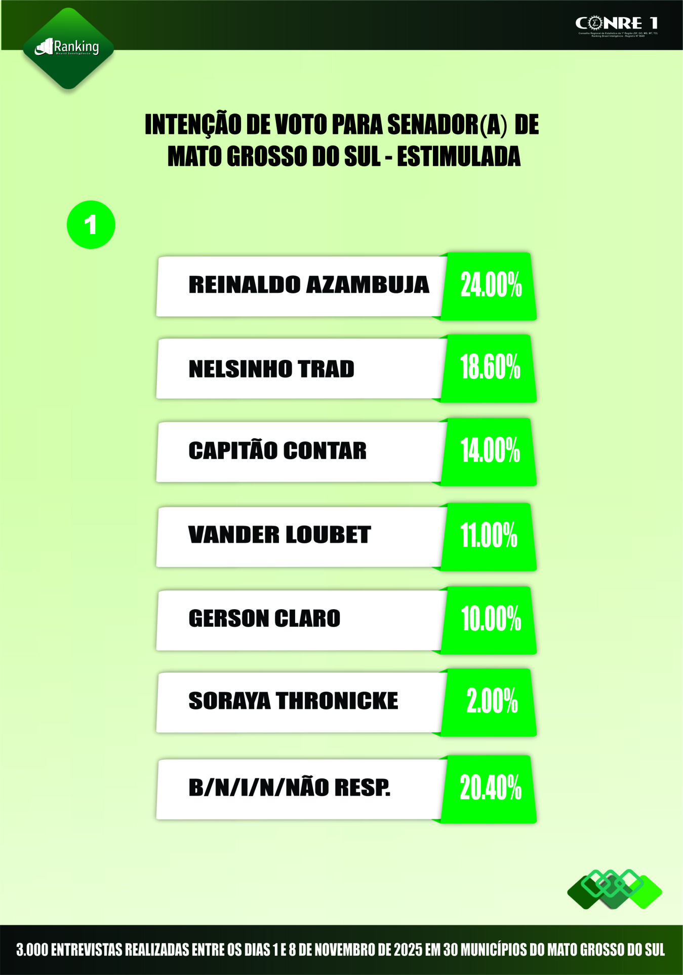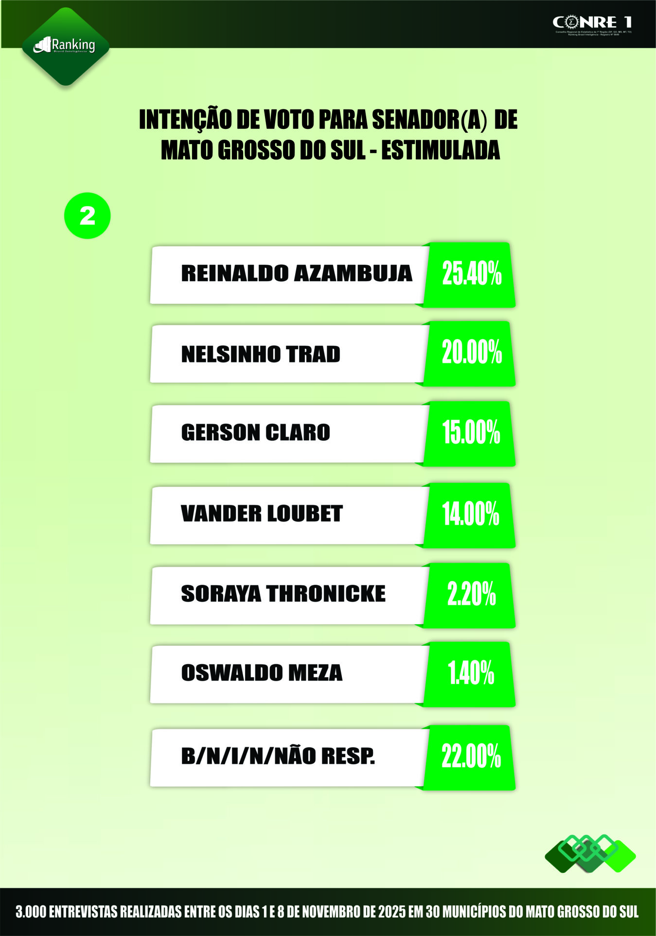 No segundo cenário da pesquisa estimulada ao Senado, Azambuja ainda lidera, com 25,4%, seguido por Nelsinho, com 20%, Gerson Claro, com 15%, Vander Loubet, com 14%, Soraya Thronicke, com 2,2%, e Oswaldo Mez, com 1,4%, sendo que 22% não sabem, não responderam, não votariam em nenhum deles ou votariam em branco.