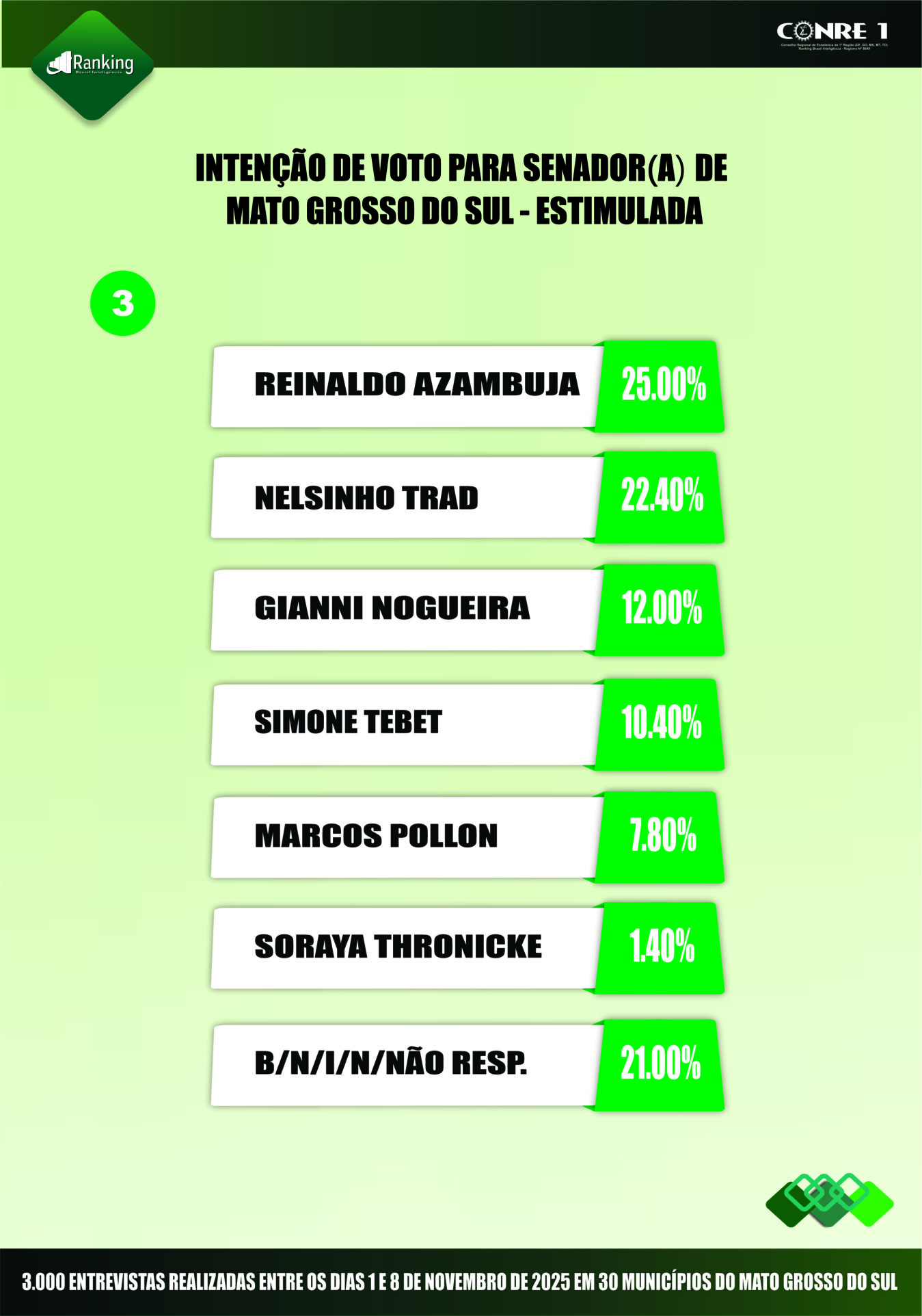 No terceiro cenário, Azambuja ainda mantém a liderança, com 25%, seguido por Nelsinho, com 22,4%, Gianni Nogueira, com 12%, Simone, com 10,4%, Marcos Pollon, com 7,8%, e Soraya Thronicke, com 1,4%, sendo que 21% não sabem, não responderam, não votariam em nenhum deles ou votariam em branco.