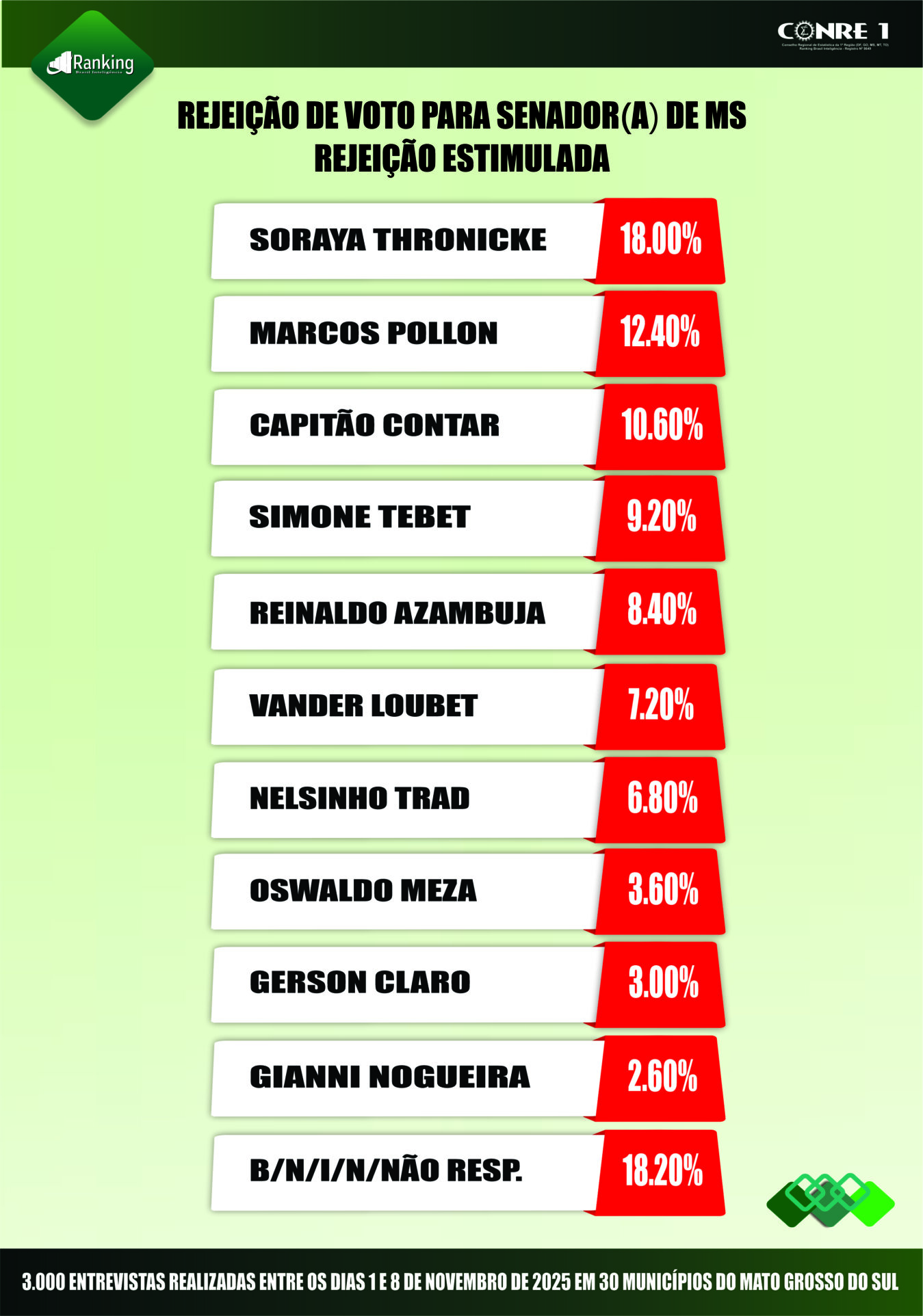 No quesito rejeição estimulada, Soraya lidera, com 18%, seguida por Pollon, com 12,4%, Capitão Contar, com 10,6%, Simone, com 9,2%, Azambuja, com 8,4%, Vander Loubet, com 7,2%, Nelsinho, com 6,8%, Oswaldo Meza, com 3,6%, Gerson, com 3%, e Gianni, com 2,6%, sendo que 18,2% não sabem, não responderam, não votariam em nenhum deles ou votariam em branco.