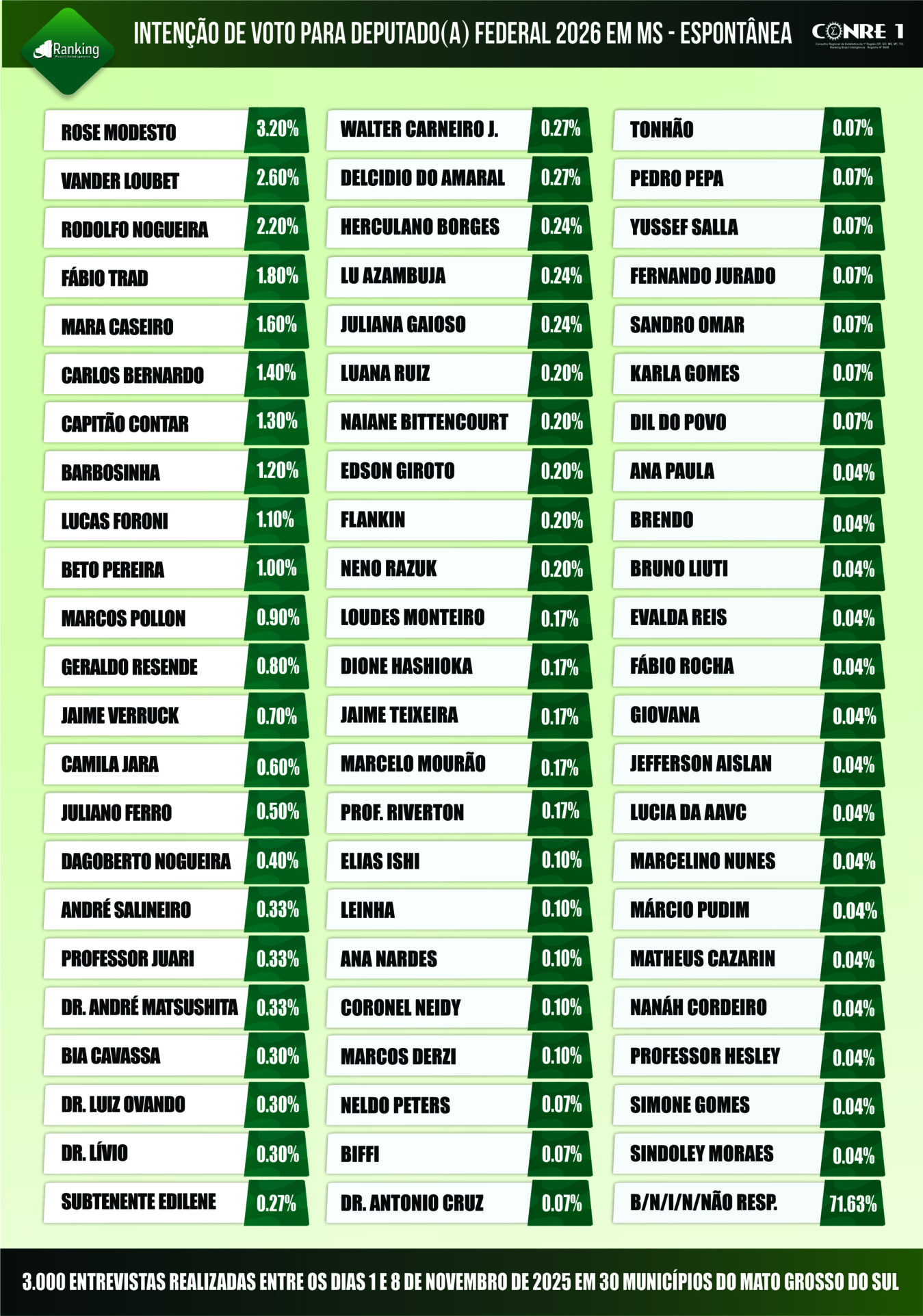 Por encomenda da Rede de Rádios Top FM, a sexta pesquisa realizada pelo Instituto Ranking Brasil Inteligência, de 1º a 8 de novembro deste ano, junto a 3 mil moradores com 16 anos ou mais de idade, em 30 municípios de Mato Grosso do Sul, com intervalo de confiança de 95% e margem de erro de 1,8 ponto percentual para mais ou para menos, traz as intenções de votos para as oito vagas de deputados federais do Estado.