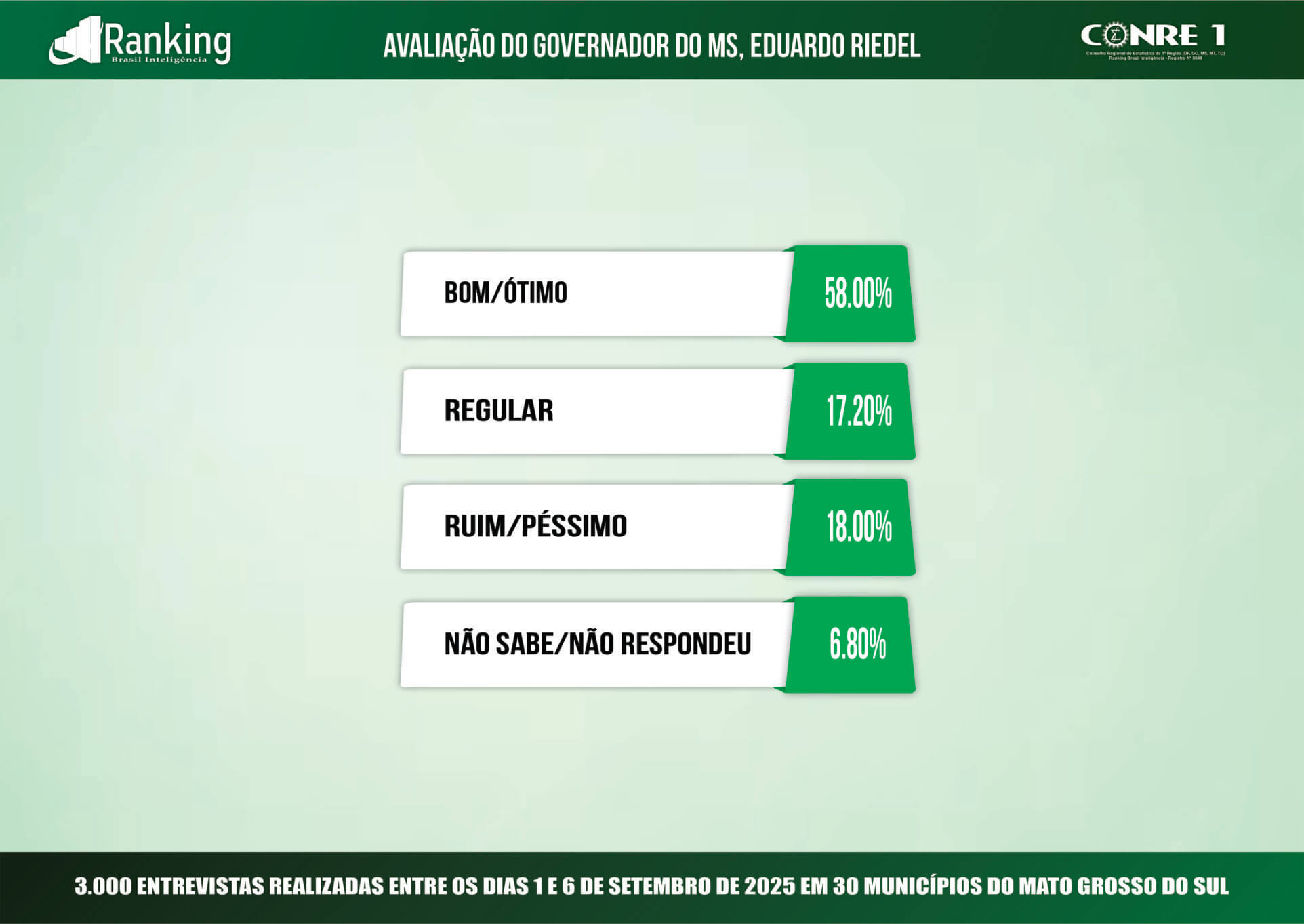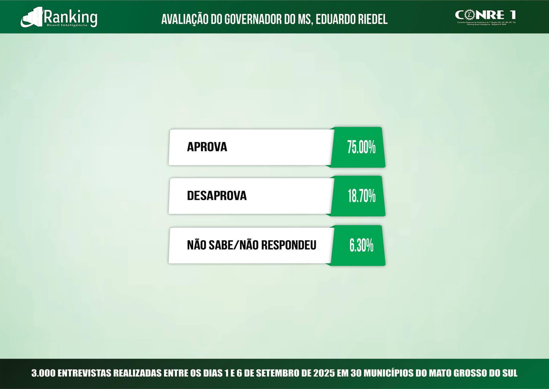 Por encomenda da Rede de Rádios Top FM, a terceira pesquisa realizada pelo Instituto Ranking Brasil Inteligência, de 1º a 6 de setembro, junto a 3 mil moradores com 16 anos ou mais de idade, em 30 municípios de Mato Grosso do Sul, com intervalo de confiança de 95% e margem de erro de 1,8 ponto percentual para mais ou para menos, traz a avaliação do governador Eduardo Riedel (PSDB).