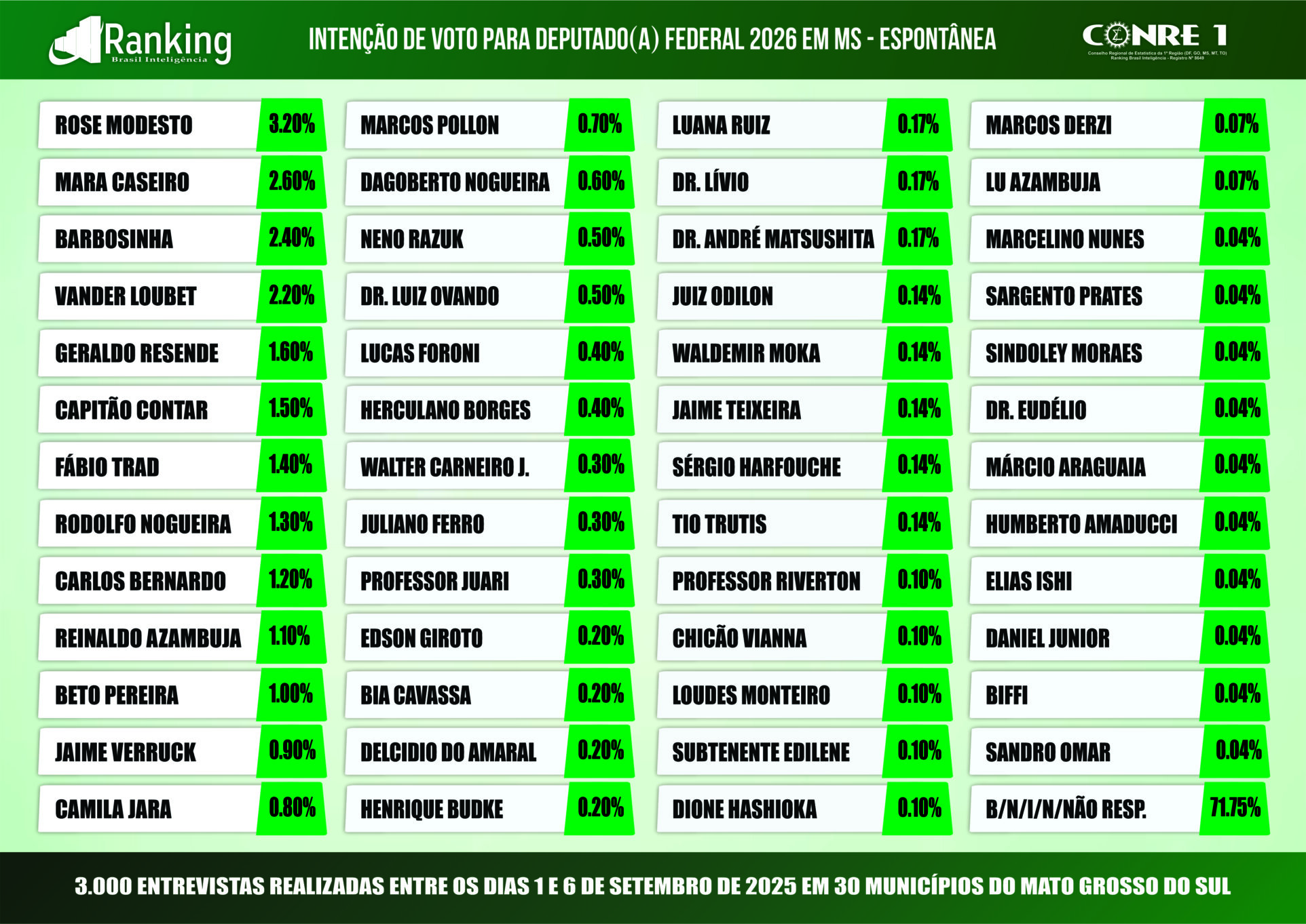 Por encomenda da Rede de Rádios Top FM, a segunda pesquisa realizada pelo Instituto Ranking Brasil Inteligência, de 1º a 6 de setembro deste ano, junto a 3 mil moradores com 16 anos ou mais de idade, em 30 municípios de Mato Grosso do Sul, com intervalo de confiança de 95% e margem de erro de 1,8 ponto percentual para mais ou para menos, traz as intenções de votos para as oito vagas de deputados federais do Estado.