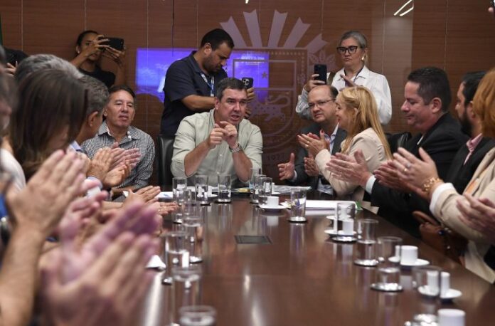 E com o objetivo de alavancar ainda mais os empreendimentos em Sonora, a prefeita Clarice Ewerling, acompanhada de sua equipe, vereadores e vereadoras, se reuniu na tarde desta segunda-feira (26) com o governador Eduardo Riedel, técnicos do Governo do Estado, secretários estaduais e parlamentares.