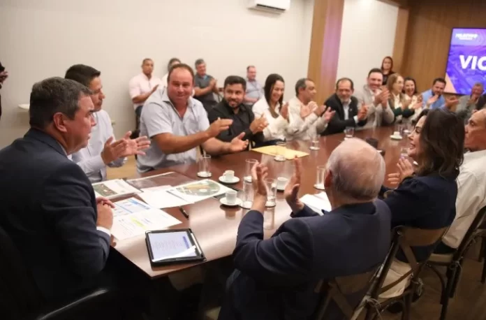 O prefeito de Vicentina, Cleber dias, acompanhado de sua equipe de trabalho, vereadores e vereadoras, esteve nesta terça-feira (27) à tarde na Governadoria para tratar de projetos para a segunda fase do programa MS Ativo Municipalismo. Na reunião com o governador Eduardo Riedel ficou acordado obras importantes como a reforma do ginásio municipal e a correção de solo em área de erosão, além da autorização para execução do projeto executivo das MS-147 e MS-283.