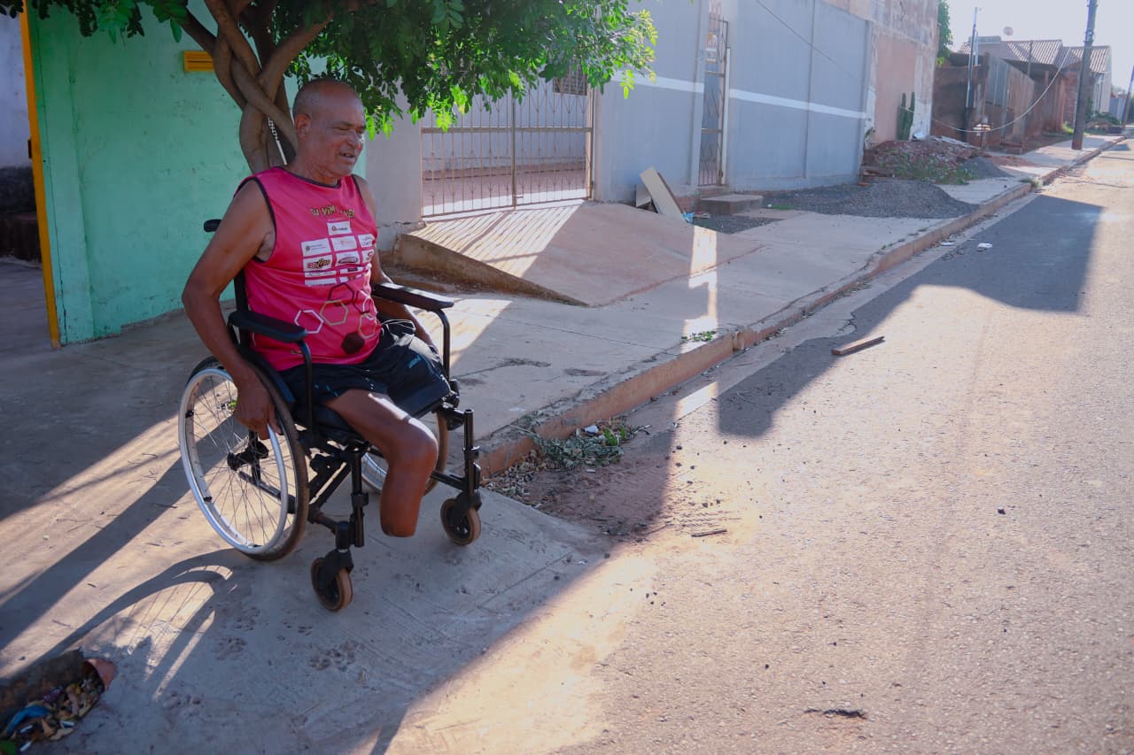 “Meu problema foi o diabetes, que atacou de forma muito agressiva. Perdi uma perna em 2023. Andava de muletas. E recentemente perdi a outra perna e isso me deixou bem abalado. Uso a cadeira de rodas, graças ao asfalto em frente de casa e chegando agora nas outras ruas, e avenidas estou conseguindo sair, ir para a farmácia, mercados e construí essa rampa em frente de casa para facilitar também”, explica o idoso.