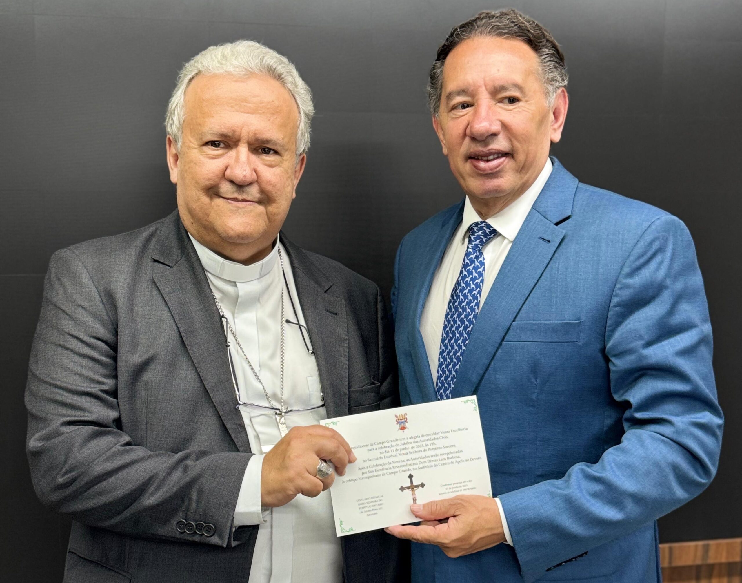 O presidente da Assembleia Legislativa de Mato Grosso do Sul (ALEMS), deputado Gerson Claro, recebeu nesta quarta-feira (14) a visita do arcebispo da Arquidiocese de Campo Grande, Dom Dimas Lara Barbosa. Durante o encontro, o arcebispo fez o convite oficial para a cerimônia de abertura do cronograma do “Jubileu das Autoridades”, marcada para o dia 11 de junho.