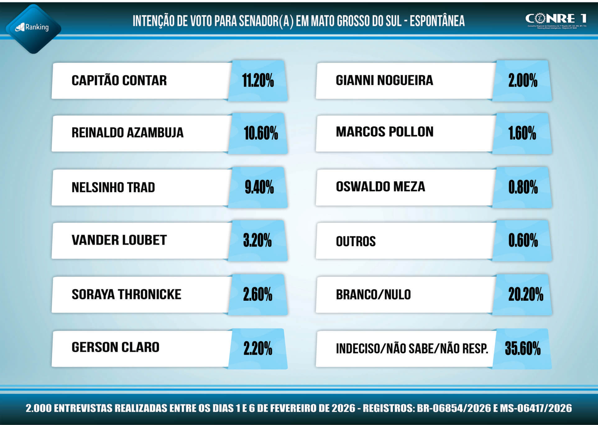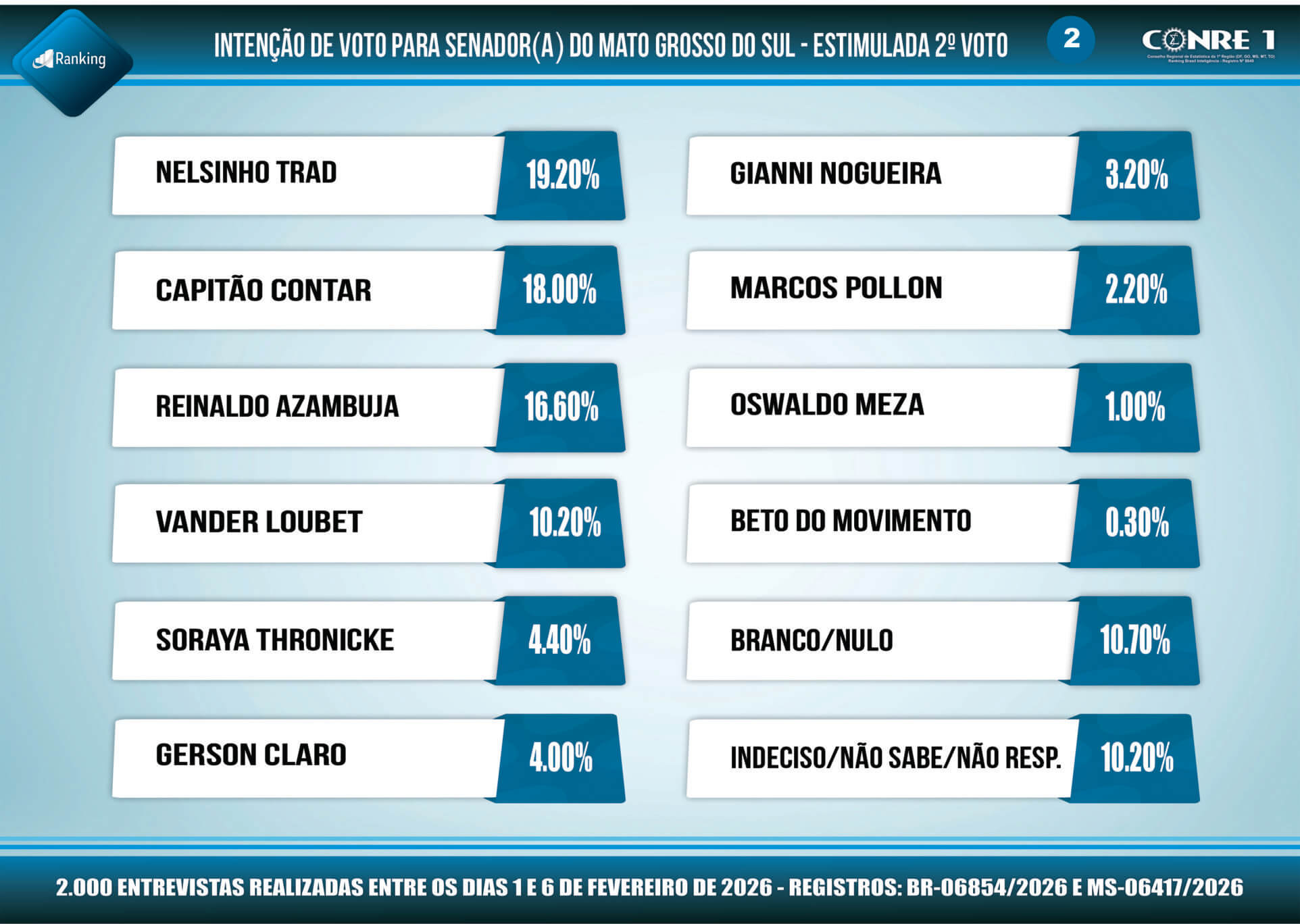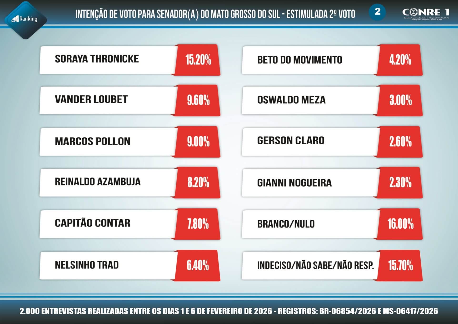 Pesquisa registrada no TSE (Tribunal Superior Eleitoral) com os números; BR-06854/2026 e MS-06417/2026, o Instituto Ranking Brasil Inteligência realizou, no período de 1º a 6 de fevereiro deste ano, junto a 2.000 moradores com 16 anos ou mais de idade, em 30 municípios de Mato Grosso do Sul, com intervalo de confiança de 95% e margem de erro de 2,2 pontos percentuais para mais ou para menos, pesquisa sobre as intenções de votos para senadores nas eleições gerais de 2026 no Estado.