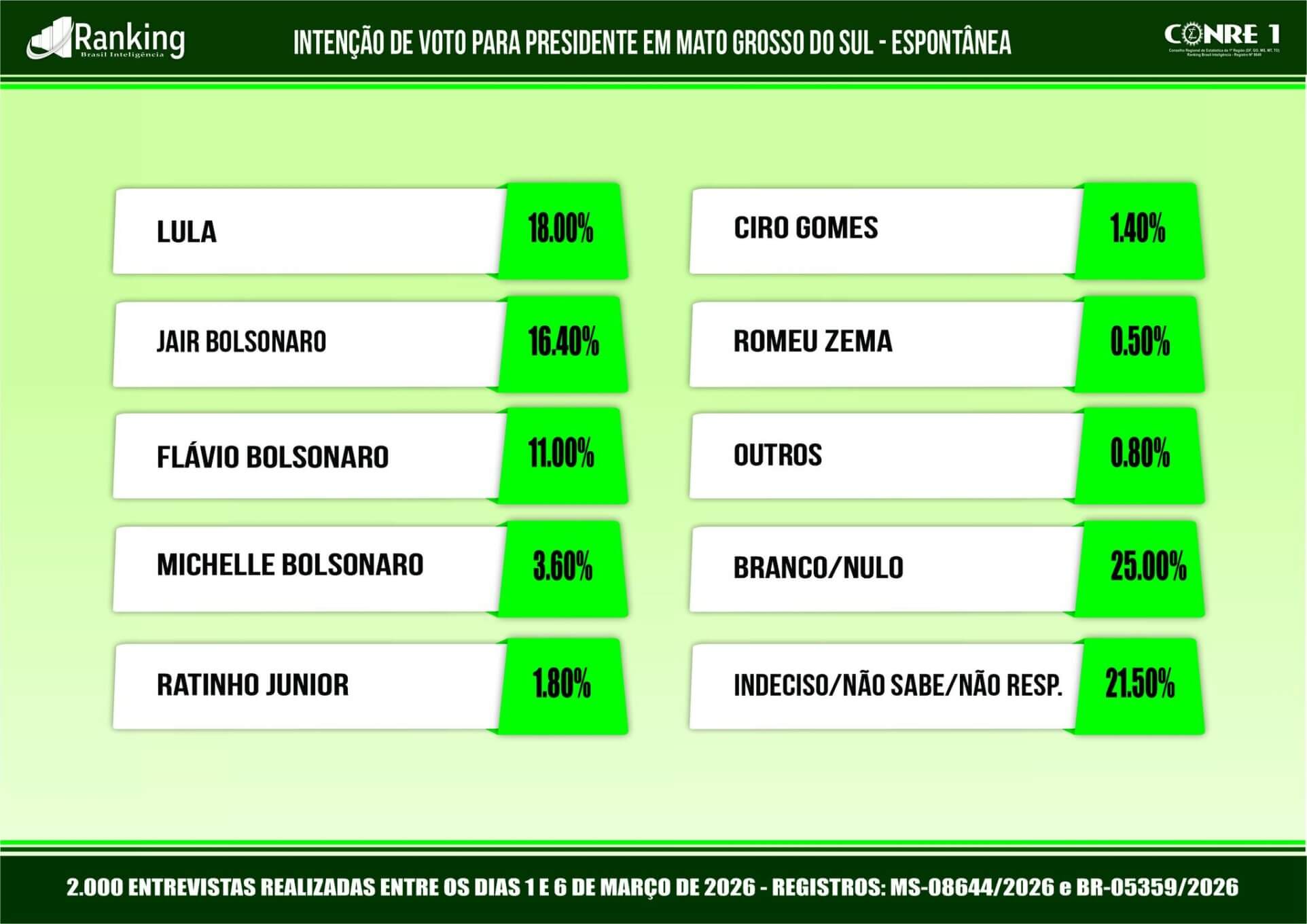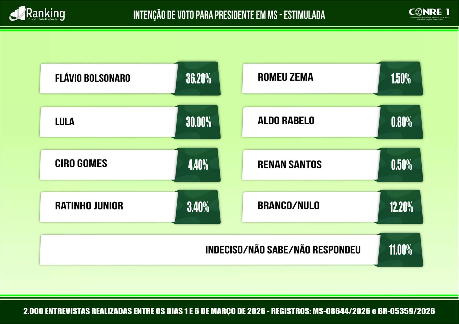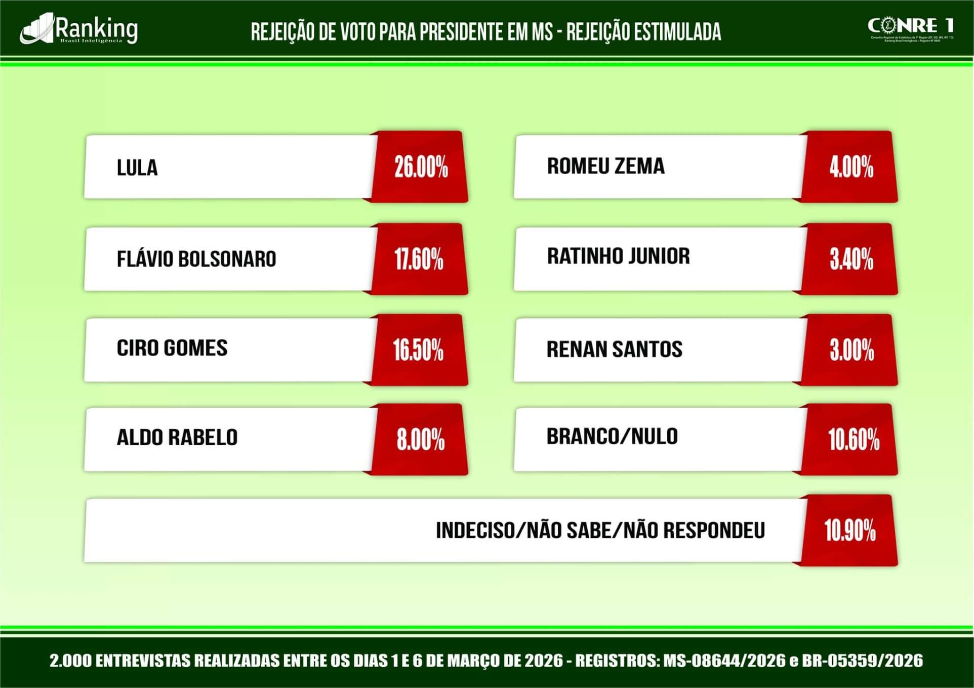 Pesquisa registrada sob o número MS-08644/2026 e BR-05359/2026, o Instituto Ranking Brasil Inteligência realizou, no período de 1º a 6 de março deste ano, junto a 2.000 moradores com 16 anos ou mais de idade, em 30 municípios de Mato Grosso do Sul, com intervalo de confiança de 95% e margem de erro de 2,2 pontos percentuais para mais ou para menos, a 2ª pesquisa sobre as intenções de votos para presidente da República nas eleições gerais de 2026 no Estado.