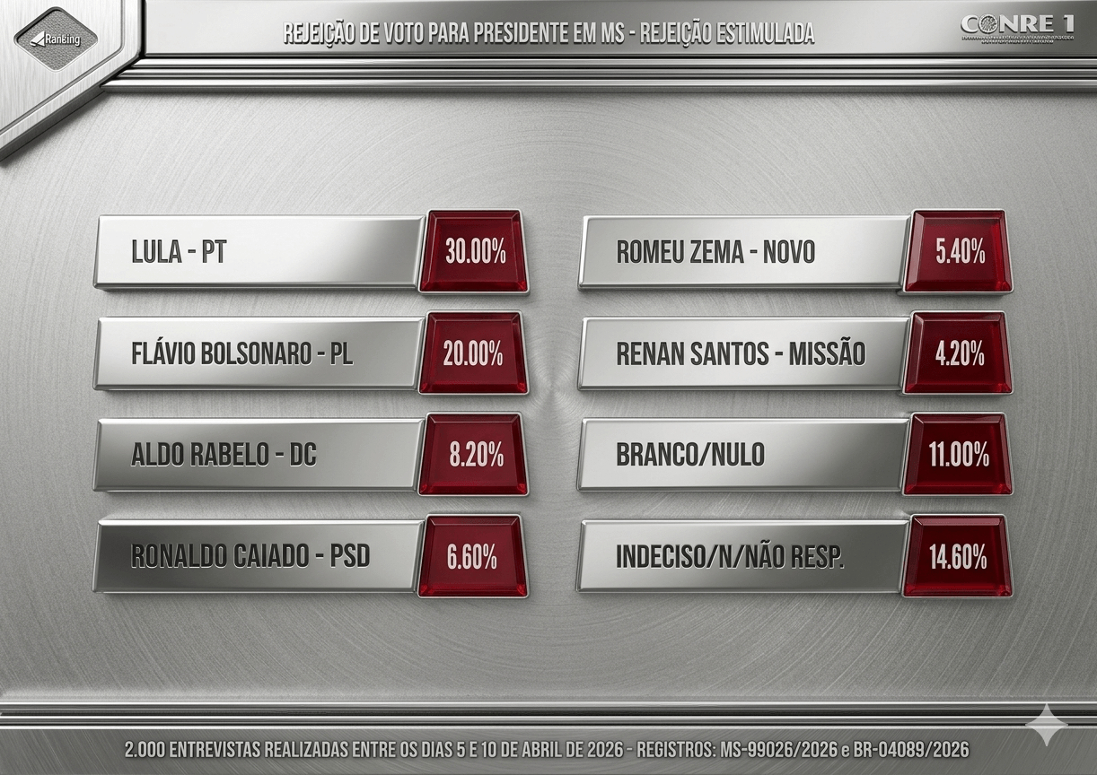Pesquisa registrada sob os números MS-09026/2026 e BR-04089/2026, o Instituto Ranking Brasil Inteligência realizou, no período de 5 a 10 de abril deste ano, junto a 2.000 moradores com 16 anos ou mais de idade, em 30 municípios de Mato Grosso do Sul, com intervalo de confiança de 95% e margem de erro de 2,2 pontos percentuais para mais ou para menos, a 3ª pesquisa sobre as intenções de votos para presidente da República nas eleições gerais de 2026 no Estado.