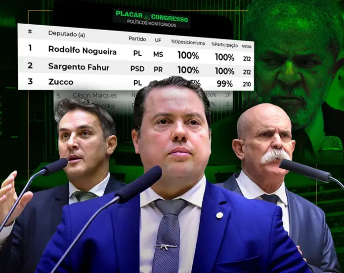 O ranking dos parlamentares mais oposicionistas do Brasil em 2025 é liderado por Nogueira em primeiro, Fahur em segundo e Zucco em terceiro.