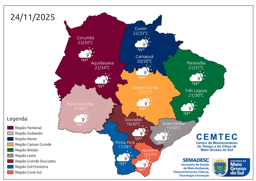A última semana de novembro começa com tempo instável em Mato Grosso do Sul. De acordo com o Cemtec (Centro de Monitoramento do Tempo e do Clima de Mato Grosso do Sul), esta segunda-feira (24) será marcada por calor e pancadas de chuva, com possibilidade de trovoadas em todas as regiões do Estado.