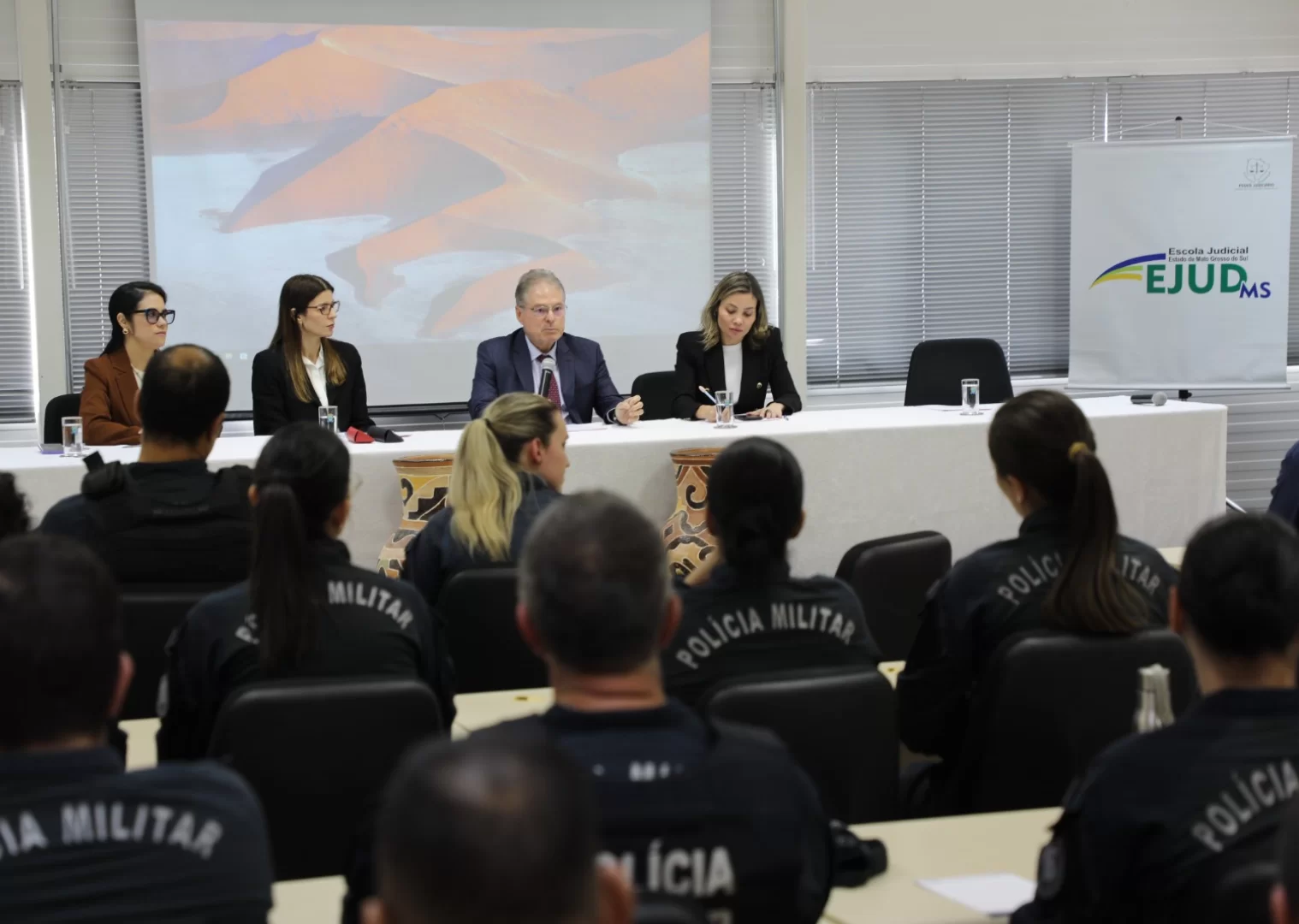 Entre os formadores docentes, a juíza Luiza Vieira Sá de Figueiredo, titular da 4ª Vara da Violência Doméstica e Familiar Contra a Mulher de Campo Grande, e a juíza Penélope Mota Calarge Regasso, que responde pela 3ª Vara, foram acompanhadas pelo oficial de justiça Claudionei Messias e pelos representantes da PM, coronel Emerson Almeida e tenente Jéssica Nascimento.